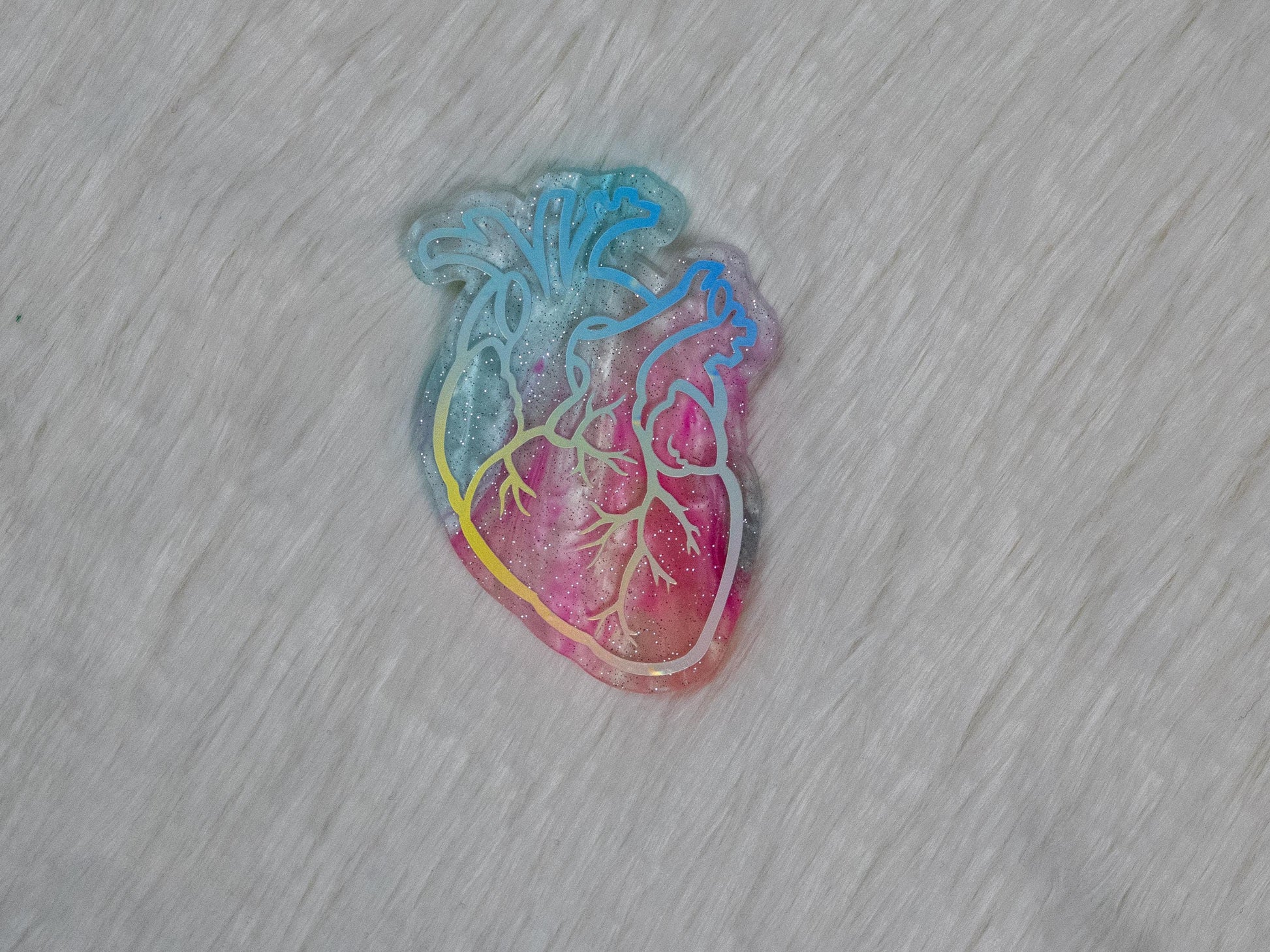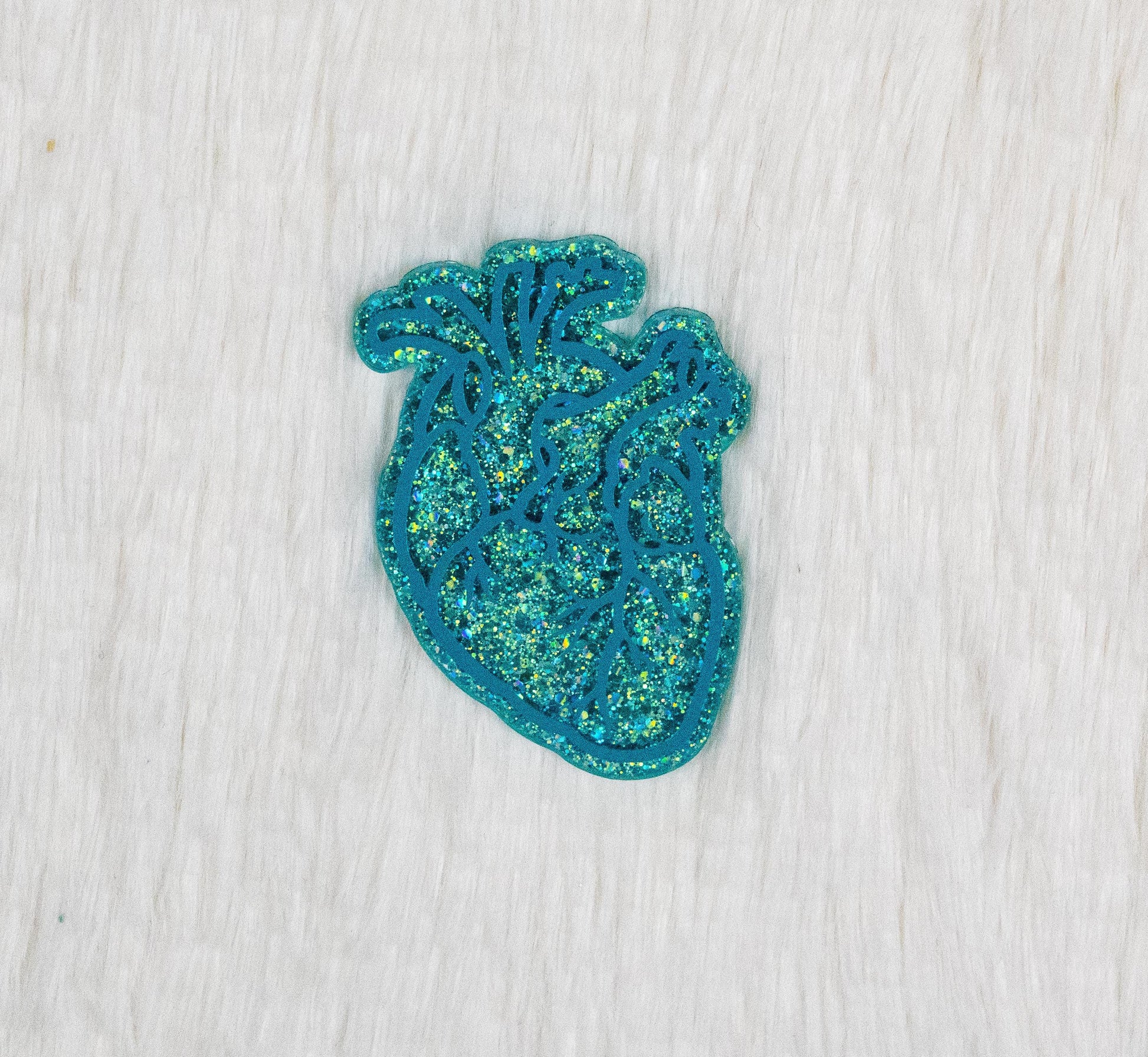 Add a little sparkle to your scrubs with this glittery anatomical heart badge reel! Perfect for nurses, doctors, students, or anyone who loves a good anatomy-themed accessory. Each heart is laser cut from glitter acrylic and finished with vinyl details for the vessels—choose from solid or shimmer vinyl to make it truly your own!